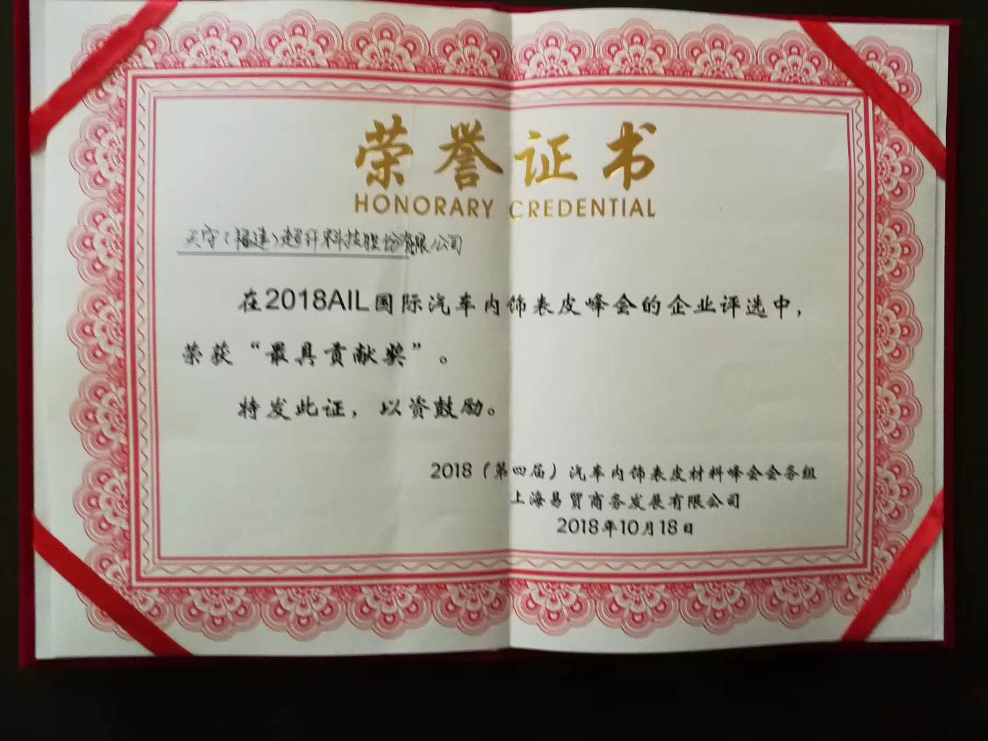 | 熱烈祝賀天守股份榮獲“2018AIL國際汽車表皮峰會最具貢獻獎” |