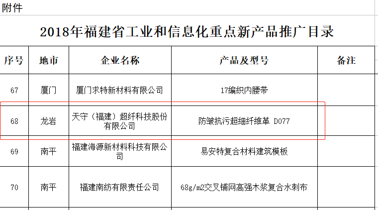 近日,福建省工業和信息化廳公布了《2018年福建省工業和信息化重點新產品推廣目錄》,我司“防皺抗污超細纖維革D077”產品榮獲2018年福建省工業和信息化重點新產品稱號。