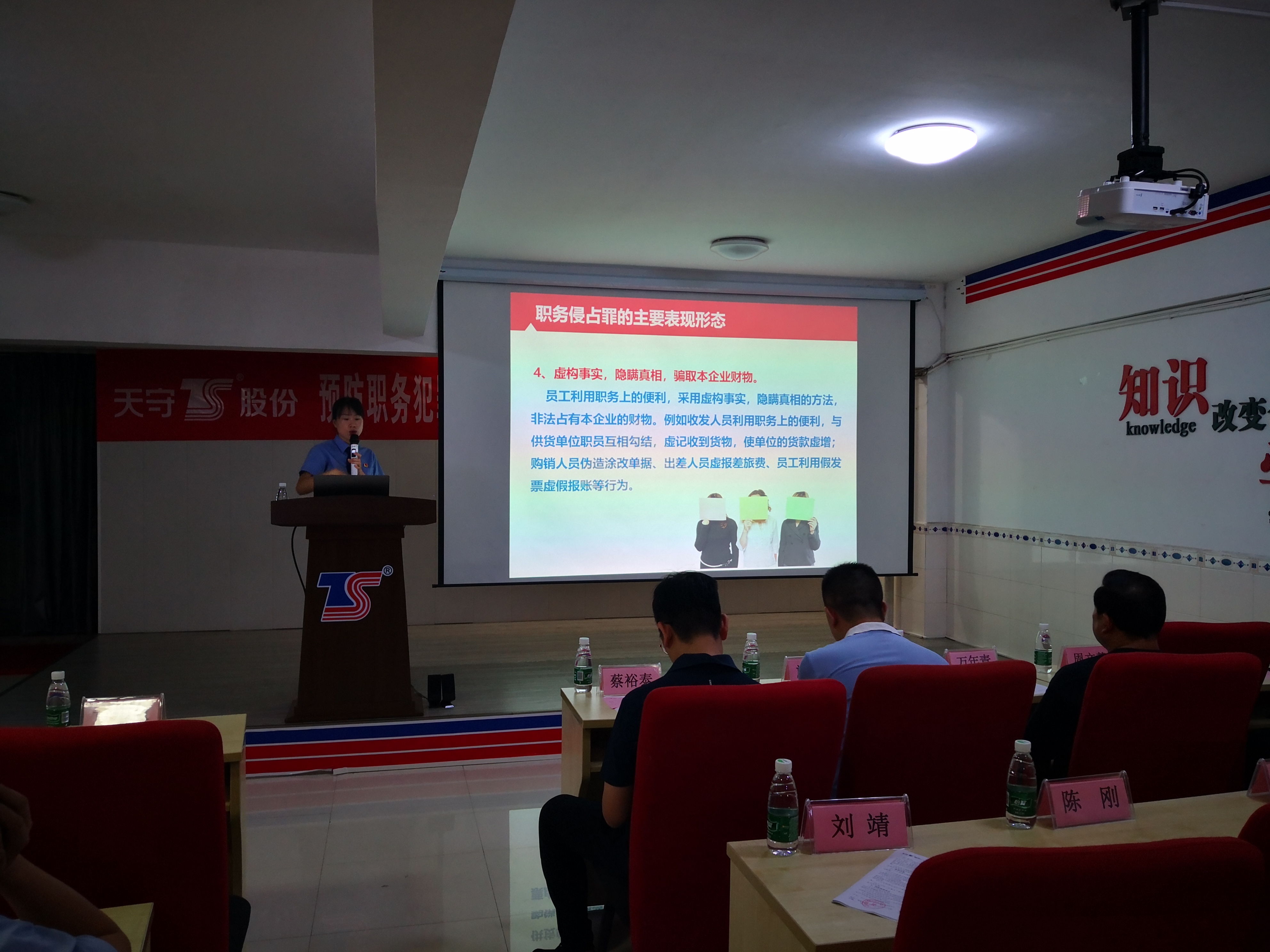 為進一步加強公司廉潔文化建設,提高公司員工廉潔自律意識,切實做好反腐倡廉工作,7月29日晚上,天守股份特邀漳平市人民檢察院黃微科長到公司開展預防職務犯罪法制講座,天守股份全體中高層、關鍵部門及崗位共百余名員工到場學習。